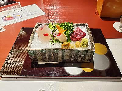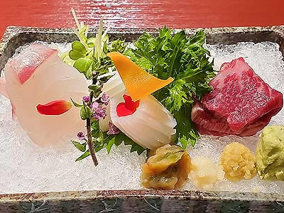 ![]() 本日の御造里三種盛り 褄物一式 鯛 甲烏賊 馬刺し |