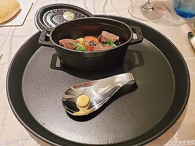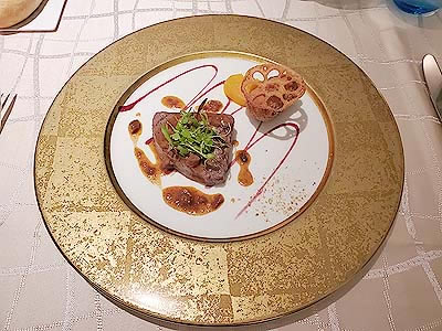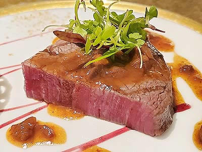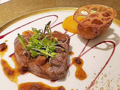 ![]() 信州プレミアム牛肉フィレのグリエ 綿内蓮根のクロケットと ポルチーニ茸とポルト酒のソース 煎り胡麻 南瓜、ブルーチーズ、ハチミツと信州味噌のピューレ |