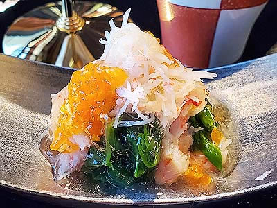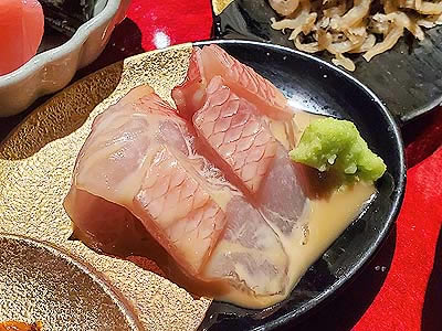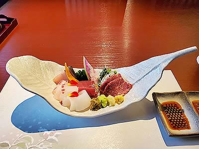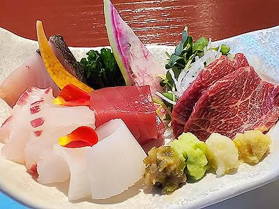 ![]() 鰆 鯛 烏賊 鮪 霜降り馬刺し 蕎麦味噌山葵 山葵 ニンニク 生姜 |