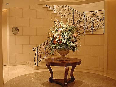2階の中国料理レストラン翠陽前の階段を下ると、日本料理レストラン初海前に出ます