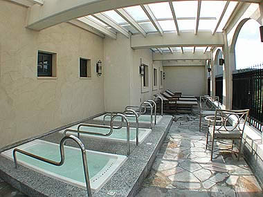 女房達家族の話によれば、女性用のスパは面積で見ると男性用と同じですが、露天風呂は白い壁で覆われていて景色を眺める事はできず、圧迫感のある造りだったそうです。最初のページに掲載したザ・ロッジから見たアロマハウスとエクシブの写真では位置的に女性用の露天風呂に壁を作らなければ中が見えてしまうのが良くわかります。露天風呂を覆う壁はどうしても必要で、仕方ない事なのかもしれません。 脱衣所は両側に並んだロッカーを使用するため、やや狭めでした。特に混み合う女性用は大変だったようです。 白濁した内湯と透明の外湯が同じ源泉から来ていると聞いて驚きましたが、どちらも気持ちの良いお湯でした。 エクシブ鳴門、ザ・ロッジ、サンクチュアリ・ヴィラそして今後オープンするサンクチュアリ・ヴィラ ドゥーエと全ての客室の数から考えて、スパのキャパシティーは小さいかもしれません。ただし、客室のテレビではスパの混雑〜空き状況やエステの空き時間等をタイムリーに見る事ができるので、行く前に確認ができて便利です。 男性用のスパは女性用のスパと異なり、露天風呂も解放感があって瀬戸内まで見渡せ、風も心地よく快適に過ごす事ができます。露天風呂に入りながら見えるエクシブやサンクチュアリ・ヴィラがとても綺麗でした。 |