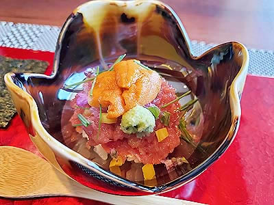 ![]() 大間まぐろと生雲丹 刻み沢庵 赤酢のシャリ |