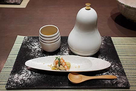 ![]() 煮物替り 沼津産黒鮑 肝和えと浜名湖の香り揚げ 白ずいき葛引き |