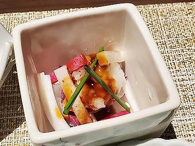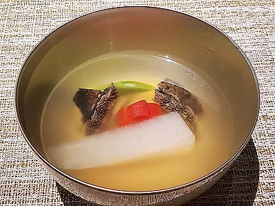 ![]() 吸物 鮑と淀大根の葛仕立て 金時人参 露生姜 |