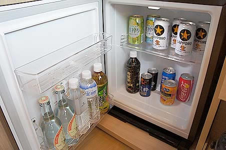 | 冷蔵庫には幾つかの有料の飲み物が用意されています | 引き出しには水割りセットと湯沸かしポット ポットの水は必要に応じてセルフサービスで入れます |